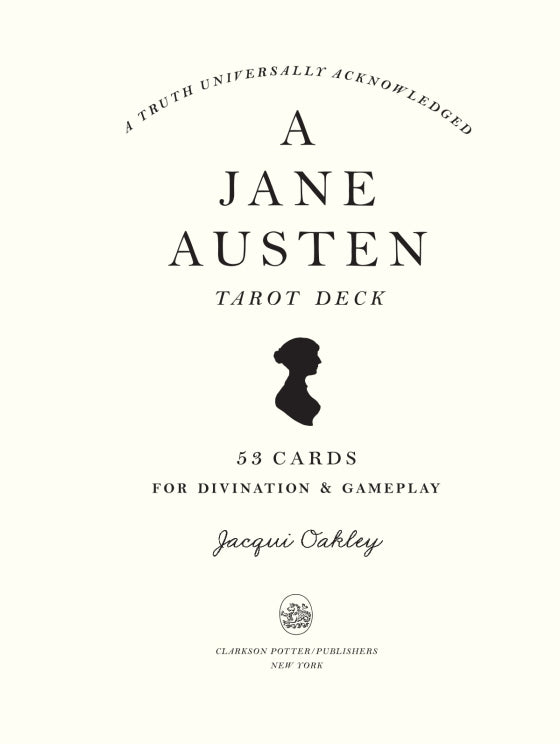 Noted Jane Austen artist Jacqui Oakley brings her beautiful work to the world of tarot with this sublime and whimsical package. Featuring 53 characters (including Elizabeth Bennet, Mr. Darcy, Elinor Dashwood, and more) and objects (such as well-trimmed bonnets and a stack of novels) from Austen's books, each card doubles as a playing card and tarot card. With Mr. Wickham from Pride and Prejudice as the Devil, a teapot representing strength, and Austen herself as the Magician, it's perfect for both longtime and new Austen fans.